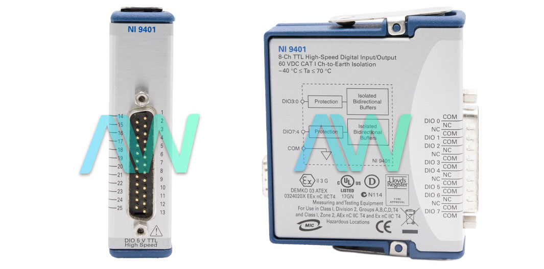 The National Instruments 779351-01 is an identifying number for the NI-9401 model, and it is designed as a versatile 8-channel bidirectional digital I/O interface. With its great degree of adjustable options, this module can be used with three different configurations: eight digital inputs, eight digital outputs, or four digital inputs and four digital outputs. Because it can be programmed using the LabVIEW FPGA Module, it can be configured in a variety of ways. This includes using reconfigurable I/O (RIO) technology, especially in CompactRIO systems, to create custom high-speed counter/timers, digital communication protocols, and pulse generation.