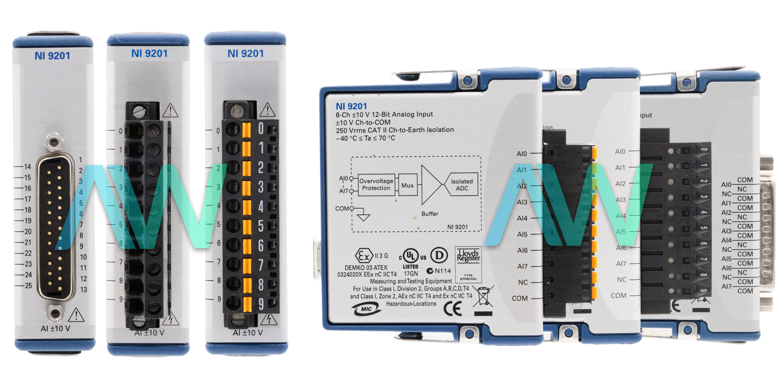 By terminal type, the NI-9201 is available in multiple variations: with a screw terminal (part number 779013-01), a spring terminal (part number 783730-01), or a DSUB connector (part number 779372-01). Part Number 189880-51 refers to the OEM model of the NI-9201. Since it is a Measurement Category II device, the screw and spring terminal connector versions of this module are designed to handle up to 250 Vrms constant voltage and can withstand 2,300 Vrms of instantaneous or surge voltages. The D-SUB connector version of the device has a channel-to-earth ground continuous voltage of 60 VDC, withstanding 1,000 Vrms. This module is incredibly reliable since it comes with 1,092,512 hours MTBF (mean time between failures) score. The NI-9201 module is compatible with the NI 9927 backshell kit that can be used for applications where high-vibrations are inevitable.