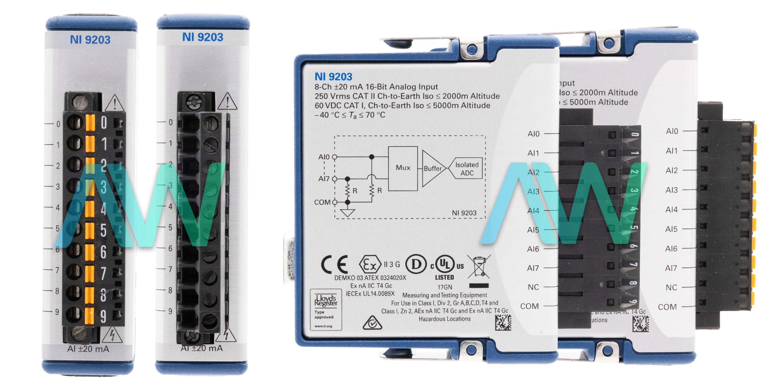 The National Instruments NI-9203 (Part Numbers: 779516-01, 783731-01, 779516-02) is a Current Input Module from the C Series. This 8-Channel module can acquire samples at 200 kS/s and is intended for high-performance monitoring and control applications. Its 8 single-ended analog input channels have a resolution of 16 bits. The NI-9203 comes featured with variable connectivity and programmable input range options. To safeguard the device against signal transients, this module has 250 Vrms, channel-to-ground dual isolation barrier. In addition, this Current Input Module has an integrated overvoltage protection for each channel that is set at ±30 V.