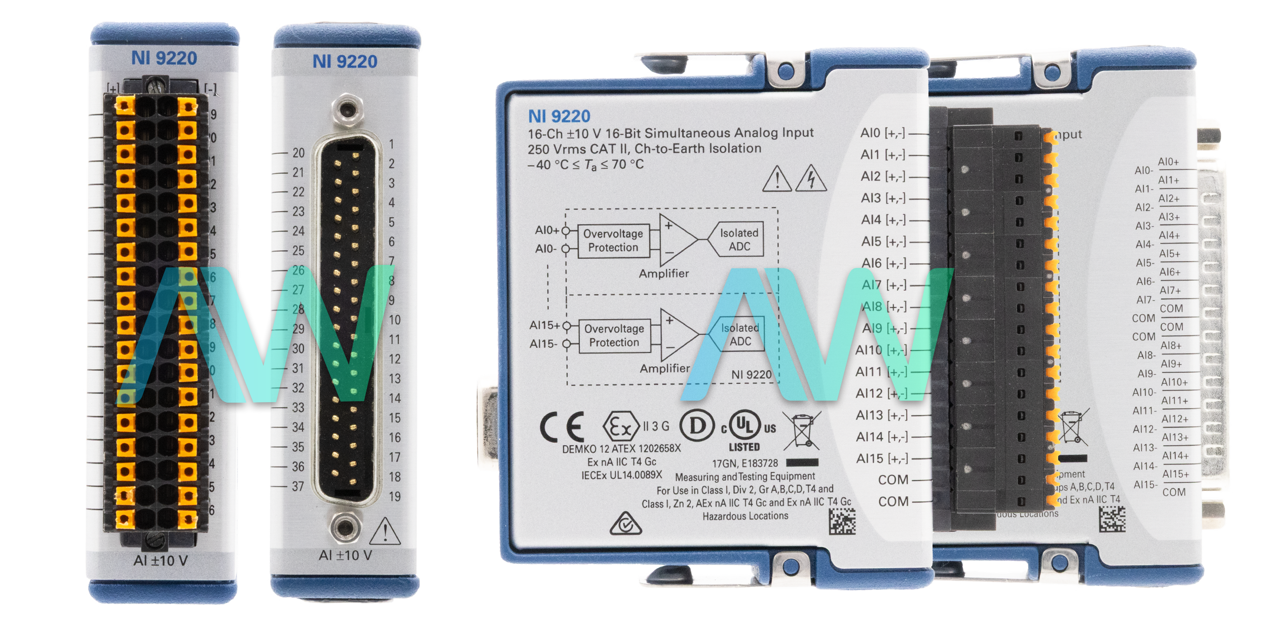 The NI‑9220 (Part Numbers: 785188-01, 782615-01, 782616-01, 782615-02, and 153289D-01L) Voltage Input Module belongs to the C Series. This module has the following characteristics: ±10 V, 100 kS per second per channel sample rate, 16-Bit resolution, simultaneous inputs, and 16 differential analog input channels. It is important to highlight that the NI-9220 performs concurrent differential simple contributions with 250 Vrms CAT II or 60 VDC CAT I isolation. It has the possibility to create 3.2 MB per second of information at the greatest inspecting rate. In addition to what was previously mentioned, the NI 9220 has two different connectors: the first one is a 36-position spring-terminal front connector and the second is a 37‑position D‑SUB front connector.