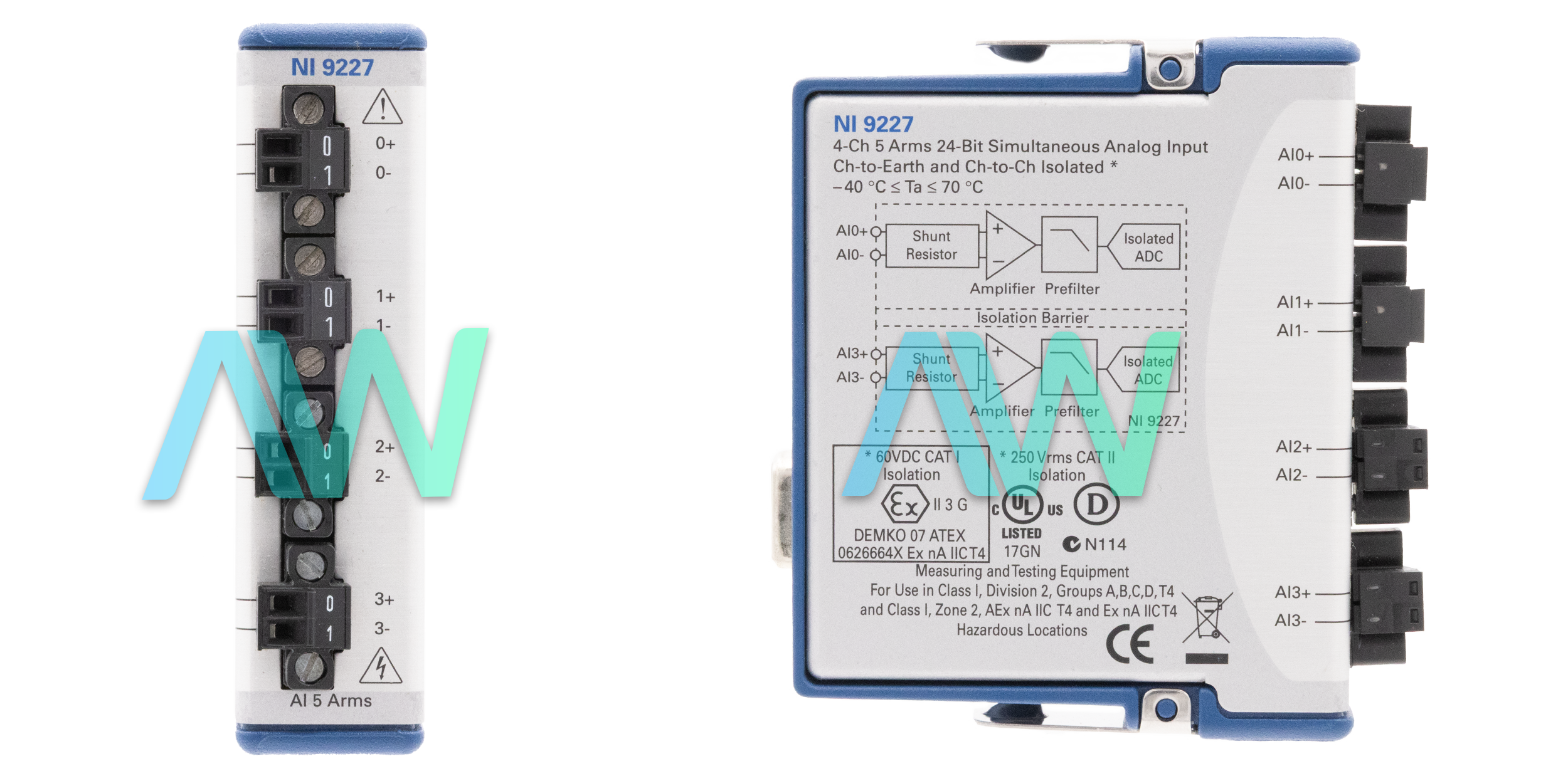 The NI‑9227 (Part Numbers: 781099-01, 781099-02, 198919B-01L) is a C Series Current Input Module, which was intended to give high-precision estimations to meet the requests of information procurement and control applications. This module comes equipped with a maximum sampling rate of 50 kS/s per channel, 5 Arms, 24-Bit resolution, and four channels. It incorporates worked anti-aliasing filters. When it is utilized with a C Series Voltage Input Module, the NI‑9227 can gauge power and vitality utilization for applications, such as apparatus and electronic gadget tests. Users can quantify and meter current and power as well as taking into consideration quality factors, such as sound, frequency, and harmonics. The two NI-9227 part numbers have the same specifications- the difference being that part number 781099-02 is conformal coated and part number 781099-01 is not.