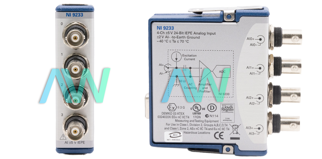 The NI-9233 (Part number: 779015-01) is an Analog Input Module from the C Series manufactured by National Instruments. The National Instruments NI-9233 Analog Input Module comes with a dynamic range of 102 decibels. The instrument incorporates four analog input channels. These channels are numbered from 0 to 3. These input channels are labeled as AIx. The subscript “x” represents the number of channel in this notation. These input channels come with the BNC connector type interface. The National Instruments NI-9233 Analog Input Module also offers a resolution of 24 bits for ADC. The device should be externally calibrated at least once a year.