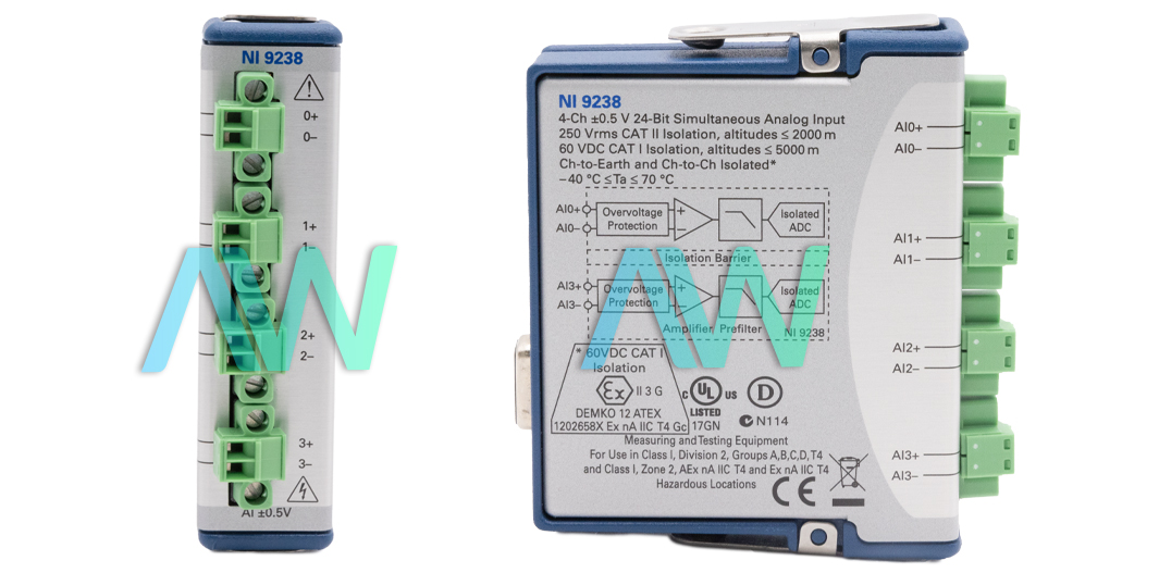 The National Instruments NI 9238 Voltage Input Module supports only DC input coupling and has screw-terminal connectivity. The input channels of this device operate at >1 GΩ impedance. While operating in typical conditions, the NI-9238 incurs 3.9 μ Vrms input noise. In optimum calibrated form, this device can operate with ±0.20% gain error and ±0.06% offset error. The device is equipped with a screw terminal front connector.