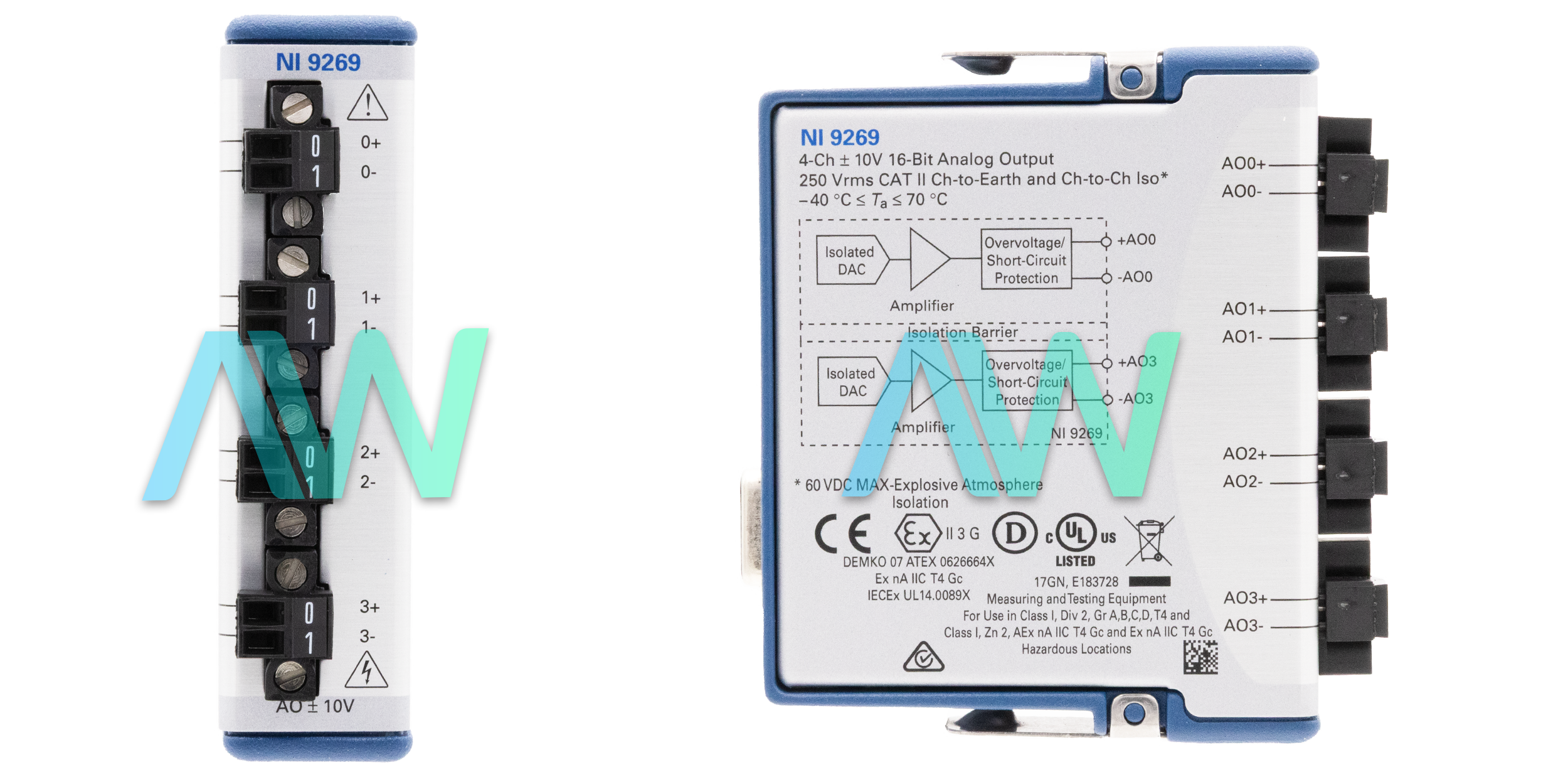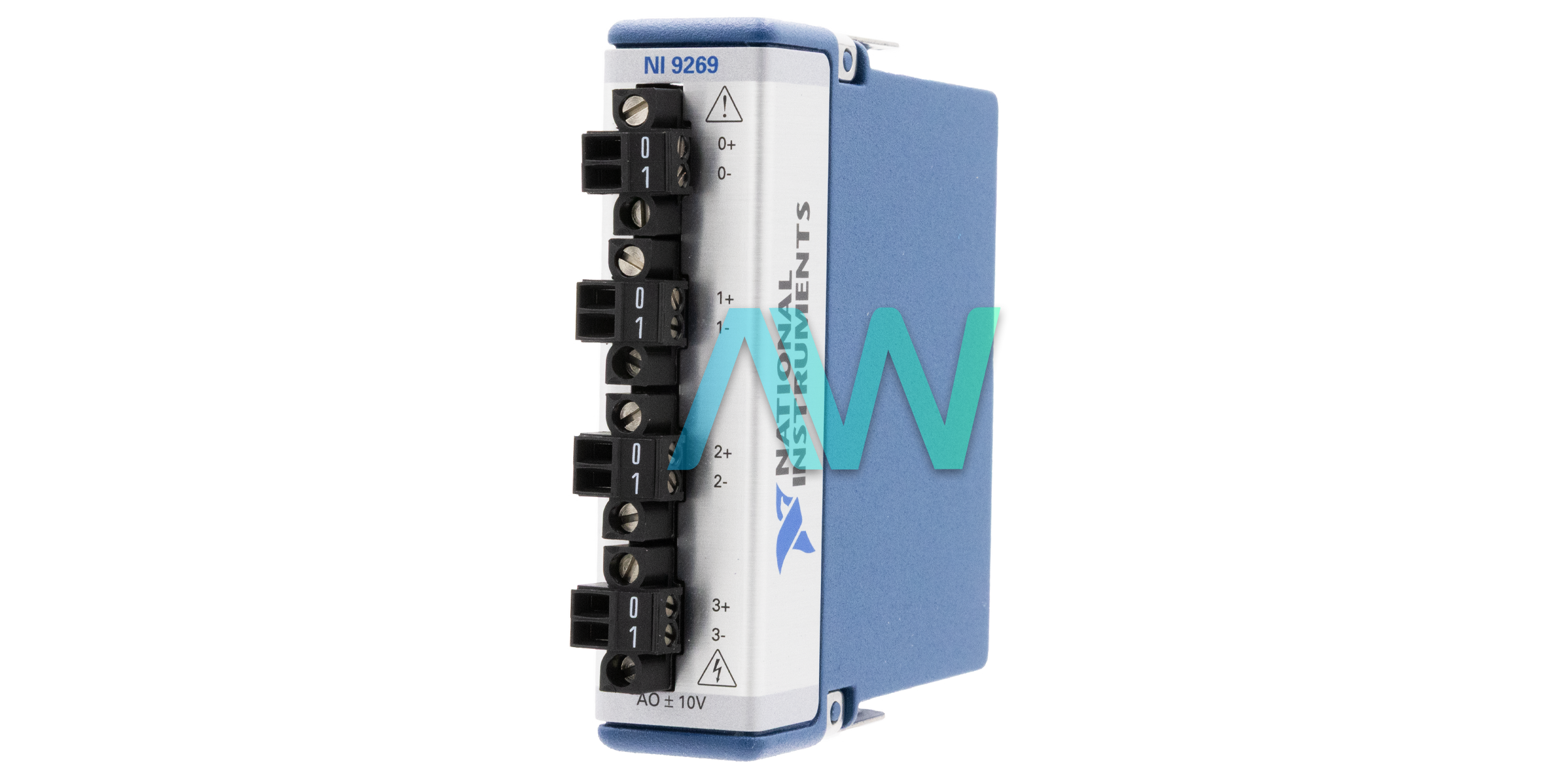 The NI-9269 (Part Numbers: 781098-01 and 781098-02) is a 16-bit, four analog output channel, 100 kS/s maximum sampling rate per channel module. The NI-9269 adds channel-to-channel isolation for expanded security, improved signal quality, and the capacity to stack channels to output up to 40 V. NI CompactDAQ support has been included as of NI-DAQmx Version 9.1. The device can be programmed using software packages like LabVIEW Professional Development System for Windows, LabVIEW FPGA Module, or LabVIEW Real-Time Module. Channel-to-channel isolation is generally required for applications that have different electrical frameworks, such as automotive test or industrial applications that are subjected to expanded noise and frequently contain various ground planes.