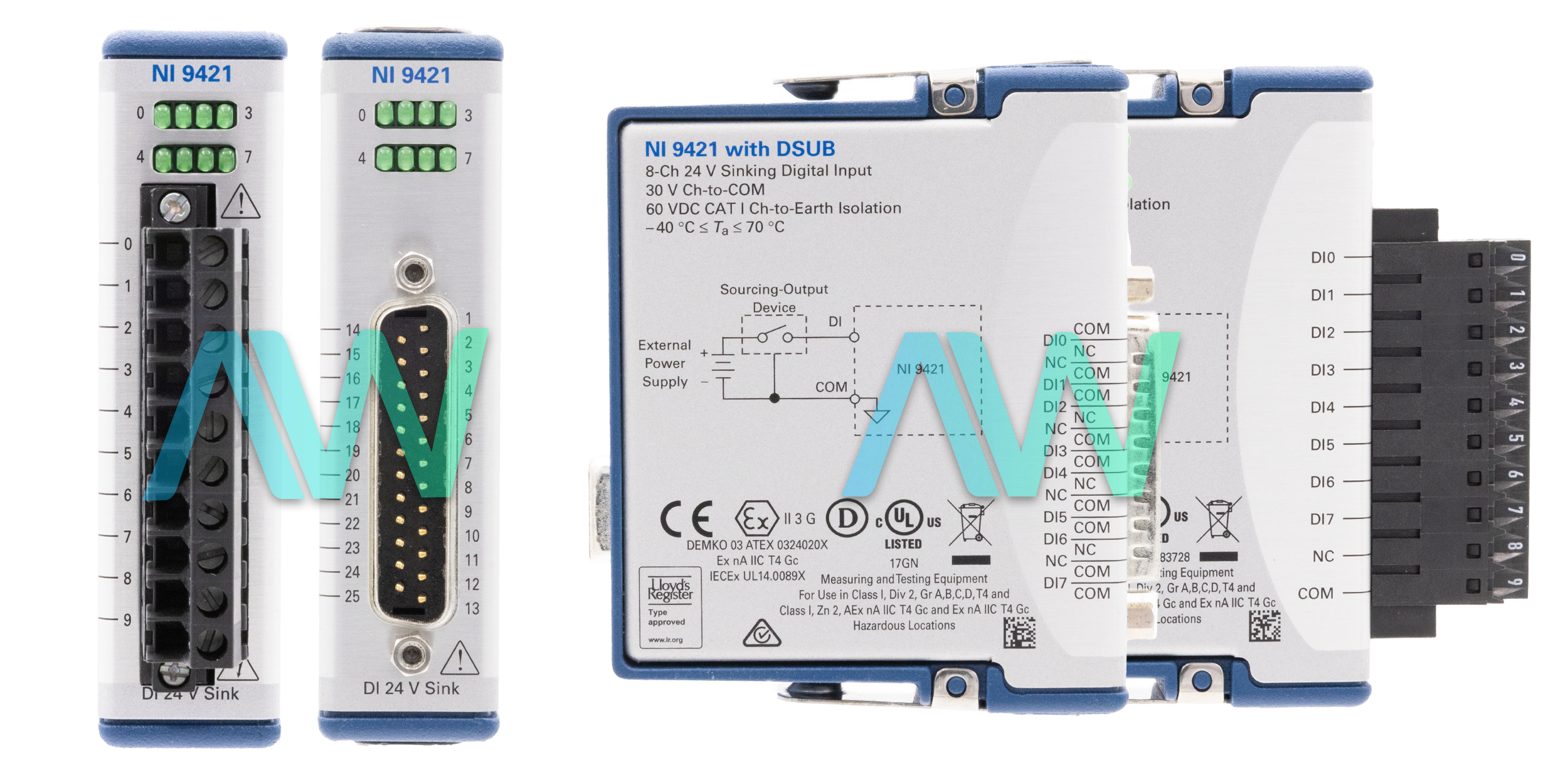 The NI 9421 (Part Numbers: 779002-01, 779136-01, 779136-02, 783734-01, 779136-02) belongs to the C Series and is a Digital Module, which works with industrial logic levels to connect specifically to a wide range of devices, transducers, and industrial switches. In addition, the NI-9421 has 8 digital input channels and Sinking Inputs. Each channel is compatible with 24 V digital I/O logic levels. To show the condition of the channel, there is an LED indicator. This module offers separation between the input channels and earth ground.