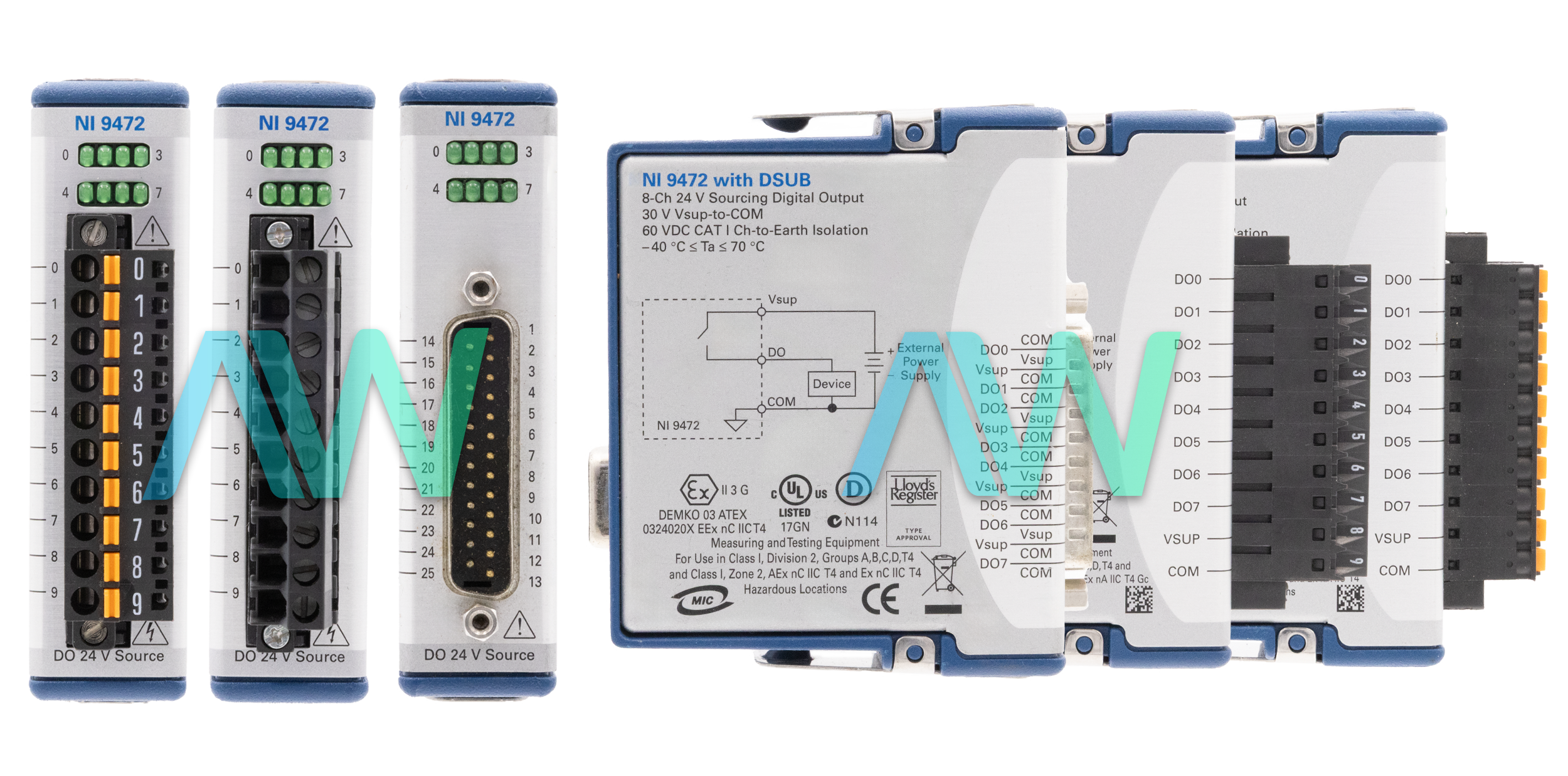 The NI-9472 (Part Numbers: 779004-01, 783907-01, 779137-01, 779004-02, 189200-51, 189200C-01) is a 24 V Digital I/O Module designed to work with industrial logic levels and signals. This model has 8 channels and 100 µs. The NI-9472 comes from the C Series of National Instruments Modules. Part number 779004-01 has a screw terminal connection, part number 783907-01 has a spring terminal connection, part number 779137-01 has a D-SUB connection, and part number 779004-02 has a screw terminal connection that is conformal coated. Part number 189200-51 is the Red Module OEM version of the NI-9472.