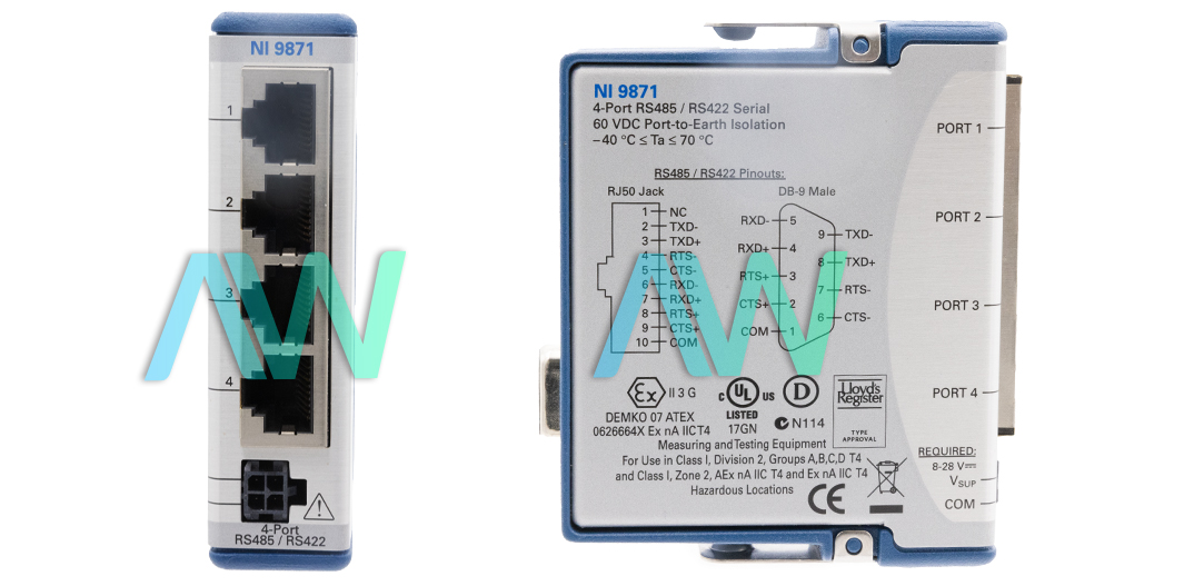 The National Instruments NI-9871 (Part Numbers: 779892-01, 779892-02, 779892-03) is a 4-Port RS485/RS422 Serial Interface Module designed to add serial communication capabilities to CompactRIO systems. The four independent ports on the NI-9871 operate in isolation from each other and from the CompactRIO chassis.