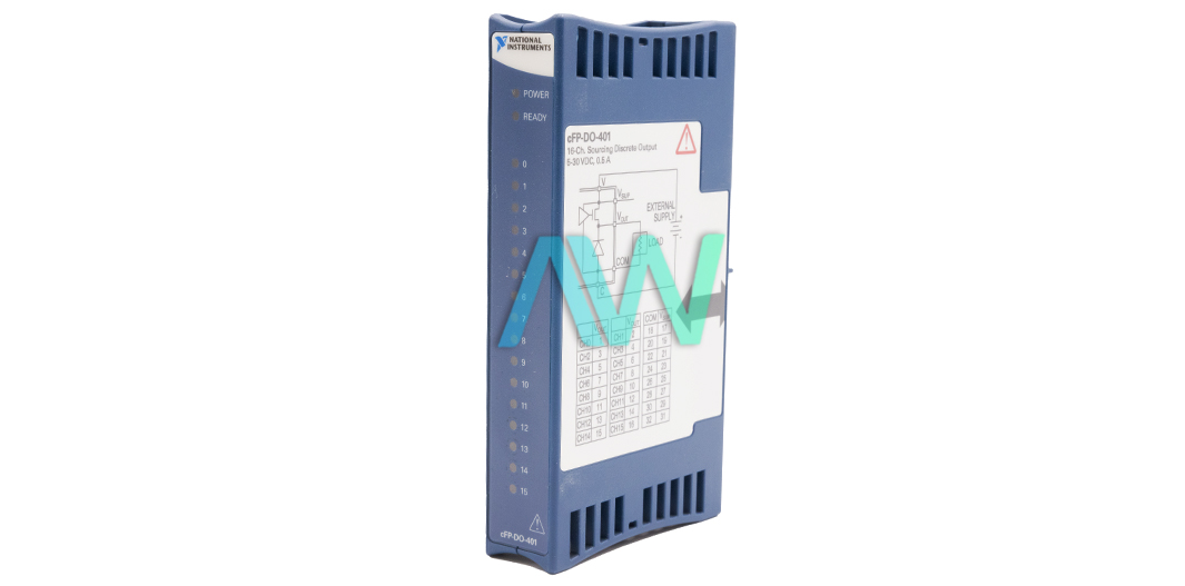 The part number 777318-401 from National Instruments is the identifying part number for the cFP-DO-401 Digital Output Module. This output module features 16-channel sourcing digital outputs with a switching voltage ranging from 5 Volts to 30 Volts DC allowing this module to control various types of devices. This module can output 1.5 Amperes of current per channel allowing it to drive load using high current directly. With 16 output terminals