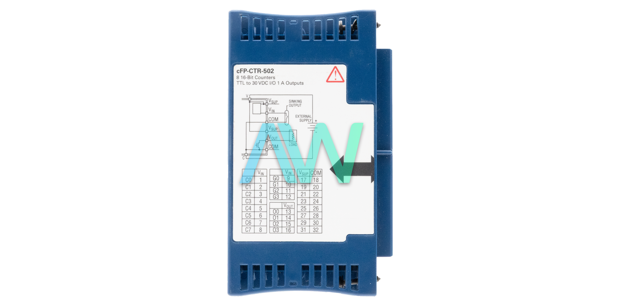 Part Number 777518-502 is the identifying part number for the National Instruments FP-CTR-502 Counter Module for FieldPoint. The 777518-502 features 12 channels, divided into 8 count and 4 gate channels. The input is sourcing type with a range of 5 to 30 VDC. They are also compatible with TTL devices and other 5, 12, or 24 VDC devices. The input bandwidth for both the count and the gate inputs is 50 KHz. However, the count inputs can have an input bandwidth of 200 Hz with a software-enabled lowpass filter. The minimum input pulse width is 10 µs at 50kHz and 2.5 ms at 200 Hz.