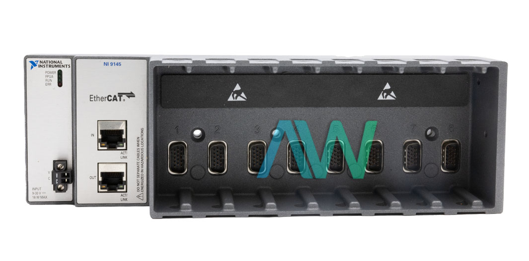 The National Instruments NI-9145 (Part number: 784756-01) CompactRIO Chassis is a highly durable model for incorporating deterministic, distributed I/O to any CompactRIO, PXI, or industrial controller with dual Ethernet ports. For fast expansion of a real-time system, this Chassis can be configured using Scan Mode. The front panel of the NI-9145 has a FPGA LED which can be used to easily retrieve application statuses or debug applications. The NI-9145 has EtherCAT compatibility, a 100BaseTX Ethernet network interface, 100 m/segment maximum cabling distance, and 100 Mbps communication rates. This model also features a Xilinx Zynq-7000 XC7Z020 FPGA, which can be reconfigured for custom use. The reconfigurable FPGA has 4,480 kbits available block RAM, and 106,400 flip-flops, 85,000 logic cells.