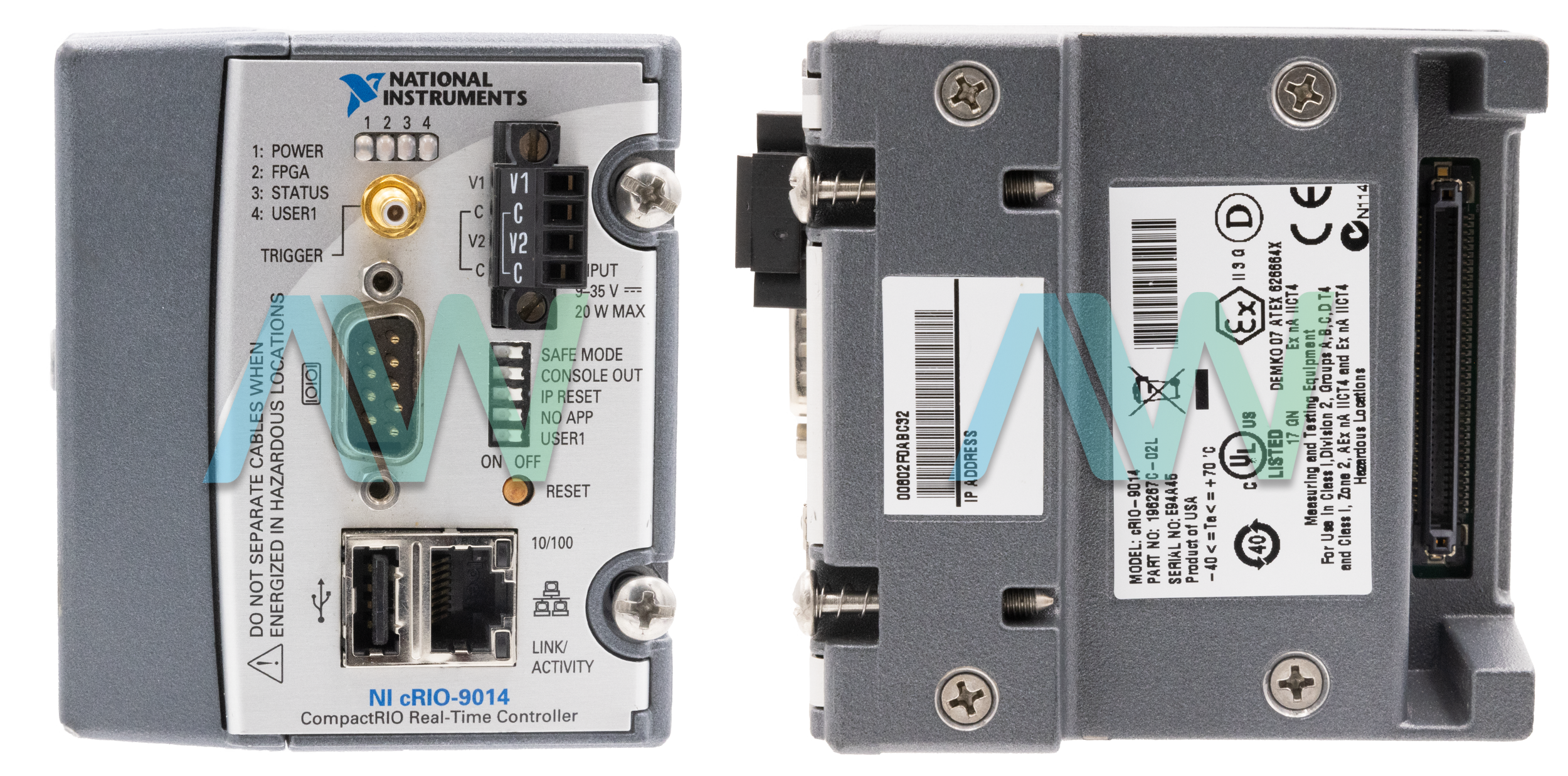 The cRIO-9014 (Part numbers: 779564-01 and 779564-02) is a CompactRIO Controller developed by National Instruments. This model is used to control and monitor C Series applications. The cRIO-9014 incorporates several ports for various connections. These ports include USB, Ethernet, and a serial communication terminal. The Controller cannot be connected with the C Series devices directly because no such slot is available. However, the NI cRIO-9014 can be interfaced with the C Series device through an extension, which would be a compatible CompactRIO Chassis. The embedded file system of the cRIO-9014 is fault-tolerant which ensures that logged data does not get corrupted due to any reason. Thus, reliable data logging is ensured. The difference between the two cRIO-9014 part numbers is that part number 779564-02 has a conformal coating.