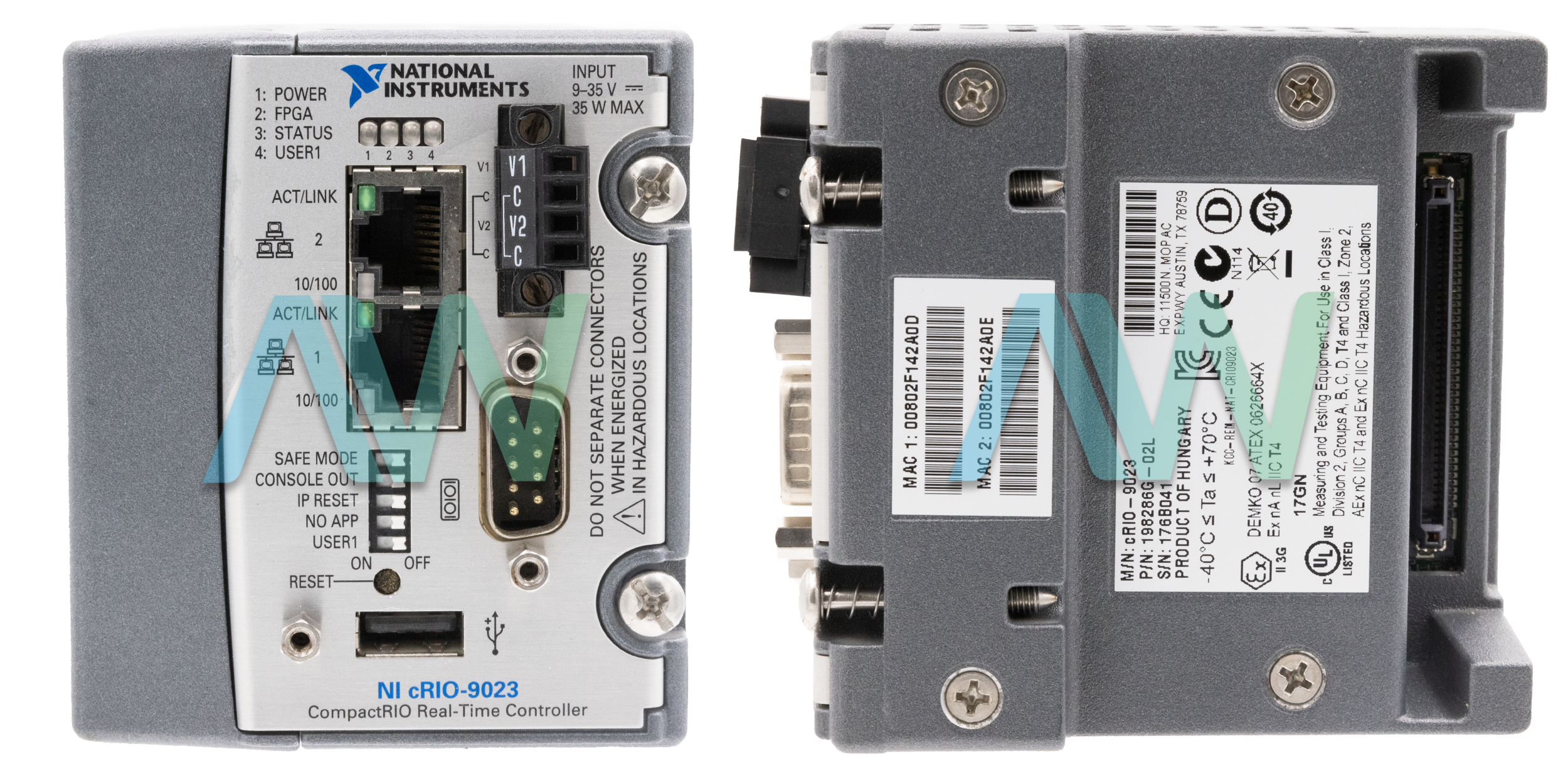 The NI cRIO-9023 CompactRIO Controller incorporates a 533 MHz real-time processor, which is the Freescale MPC8347 type. This model has two Ethernet ports. The Ethernet ports support a cabling distance up to 100 meters per segment. The NI cRIO 9023 supports a remote user-interface through Ethernet ports. This model also has an RS-232 serial port. The baud rate of the serial port is in the range of 600 bps - 230.4 kbps. The Controller also features a USB port. USB-based storage media can be connected to the cRIO-9023 through this port to increase the memory. The data rate of the USB port is up to 480 Mb/s. The non-volatile memory is 2 GB. The Controller also has a DRAM size of 256 MB.