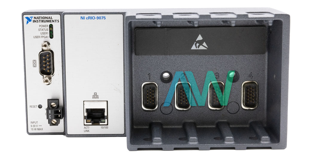 The National Instruments cRIO-9075 (Part Number: 781715-01) is a 4-Slot CompactRIO Legacy Controller. This model features 400 MHz CPU, 256 MB of Internal Storage, 128 MB DRAM, and an FPGA (Spartan-6 LX 25 by Xilinx). The FPGA circuitry provided in this Controller controls all the I/O modules and forwards data to the main Controller by means of a local PCI bus and built-in communication infrastructure.