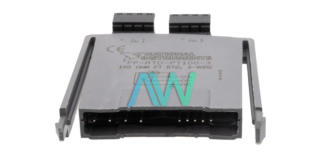 The NI FP-RTD-PT100-3 module provides a channel resolution of 12-bits for measurements. The FP-RTD-PT100-3 functions with an input impedance of 100 Ω. This module is fabricated with the linearization curves with the DIN 43760 standard RTD, which is α = 0.00385. Each channel on this RTD Analog Input Module can be programmed for the °F or °C scale. The FP-RTD-PT100-3 has two sets of screw terminals on top and does not connect to the screw terminals on the FP-TB-10 Terminal Base. This module can handle only one channel from each instrument when being used for channel-to-channel applications.