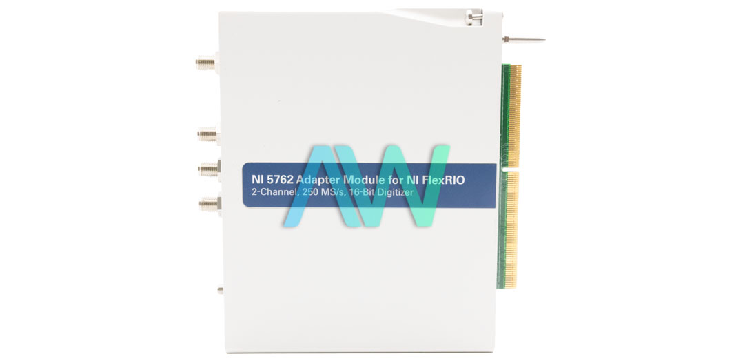 The National Instruments NI-5762 is a 2-Channel, 250 MS/s, 16-Bit Resolution, Digitizer Adapter Module for FlexRIO-based systems. When coupled with a compatible PXI FPGA Module, the NI-5762 works as a high-speed digitizer that can sample two channels simultaneously at up to 250 MS/s. This module provides two signal paths per channel: a filtered path (100 MHz elliptic filter) and an unfiltered path, enabling flexible signal acquisition.