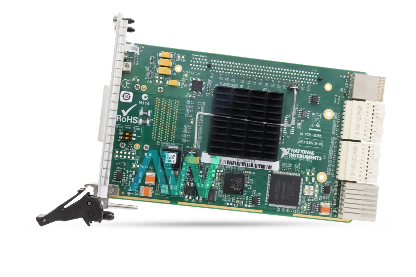 The PXIe-8388 (Part Number: 781760-01) is a Remote Control Module designed by National Instruments. This module is an x16 Gen 2 PXI Express module This module is capable of sustained throughput ranged up to 5.6 GB/s unidirectional and can also sustain throughput up to 2.8 GB/s bidirectional. The NI PXIe-8388 also features multi-chassis configuration for PXI Express Systems. This Remote Control Module is installed in a PXI Chassis.