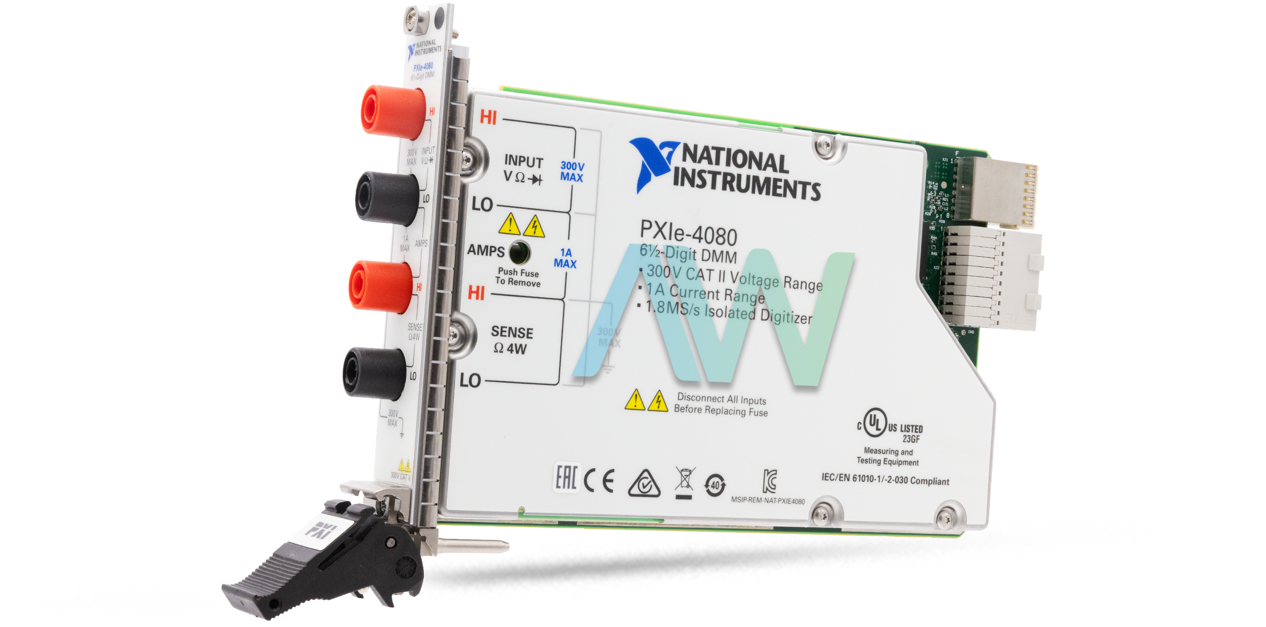 The NI PXIe‑4080 has an input impedance of 1 MΩ ± 2% in parallel with 150 pF, maximum DC voltage component of 250 V, and common mode rejection ratio (CMRR) >70 dB (DC to 60 Hz). This Digital Multimeter has a frequency range from 15 Hz to 500 KHz and period measurement range from 2 µs to 66.67 ms. The device has a current mode fuse rating T 1 A 400 V, time-lag user-replaceable Minimum interrupt rating: 500 A Littelfuse 0477001.MXP. The power consumption of the device is less than 9 W from the PXI Express backplane. It consumes a maximum of 0.55 A from both a +12 V load and a + 3.3 V load.