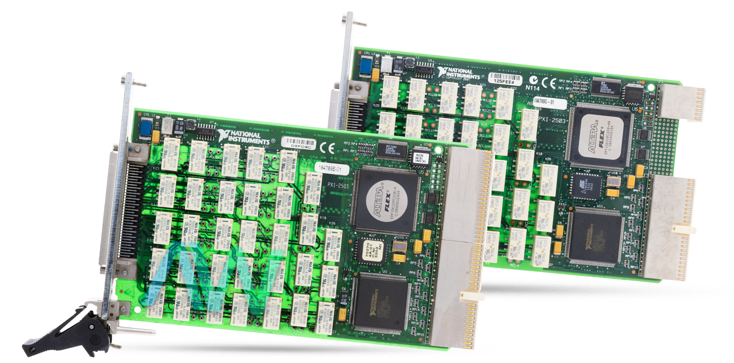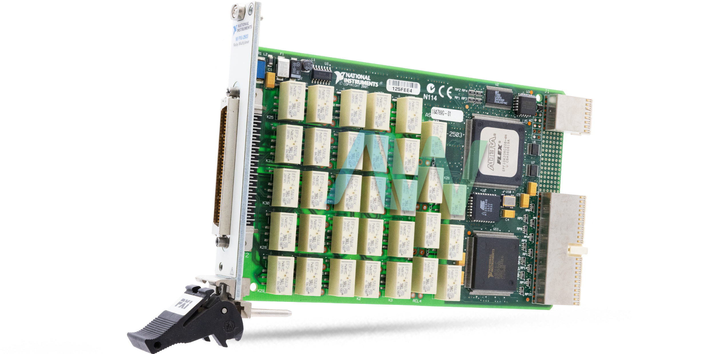 The NI PXI-2503 (Part Number: 777697-01 ) is a 1-, 2-, or 4-Wire PXI Multiplexer Switch Module. The PXI-2503 has the options of 6, 12, 24, or 48 channels- as well as a hybrid connector. This model utilizes electromechanical relays for accurate measurements. For deterministic scanning, it provides a 1,024-step scan list. The NI PXI-2503 consists of a 14 by 1, 2-wire multiplexer in PXI format. This model is offered with the Windows-based NI-SWITCH software that you can use to configure and operate your PXI-2503 switch card. With this model, the user can utilize software-configurable switches to get the PXI-2503 configured as a 48 x 1, 1-wire multiplexer for achieving many measurements at a common reference. Besides, this electromechanical switch can operate as a 12 x 1, 4-wire multiplexer for making resistive measurements such as RTDs or thermistors. The device has a switch bandwidth of 10 MHz. Finally, users can also get this card configured as a 6 by 4, 2-wire matrix with the help of a National Instruments TB-2606 terminal block.