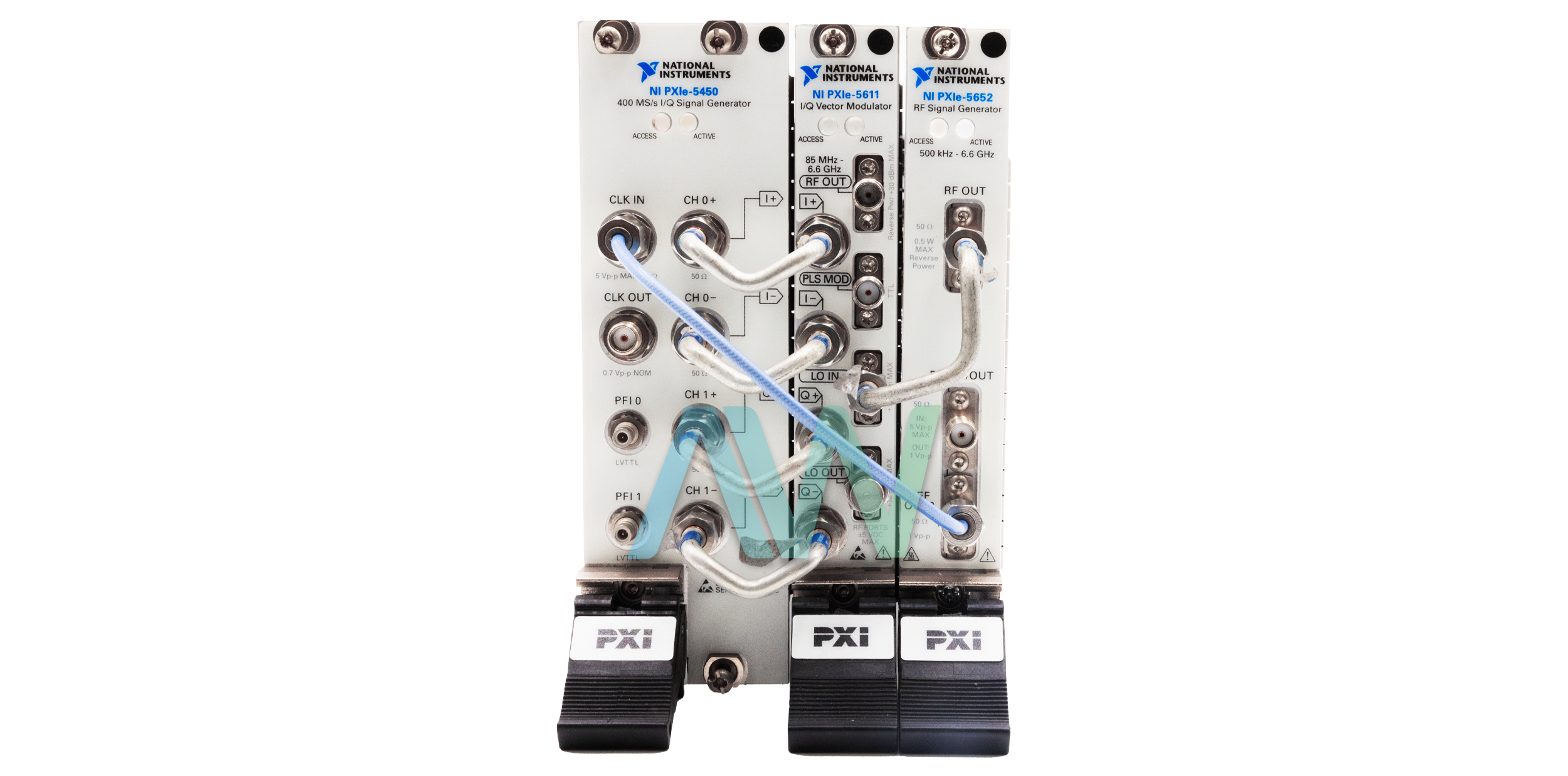Answer: The NI PXIe-5673E is comprised of the PXIe-5450/5451 Arbitrary Waveform Generator Module, PXIe-5611 I/Q Modulator Module, and PXIe-5650/5651/5652 Local Oscillator (LO) Source Module.