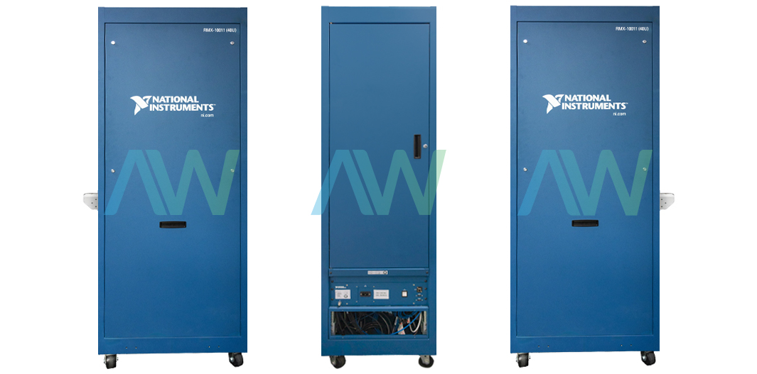 The RMX-10011 integrates core mechanical, power, and safety features to support both National Instruments and third-party instrumentation. It also features a 24U or 40U rack-mounted enclosure and a dual-fan cooling system with both a high-speed and low-speed fan panel (1350 CFM and 540 CFM). Additionally, the RMX-10011 is equipped with several safety features such as temperature-controlled auto shutdown to prevent overheating and circuit protection with independent power breakers.