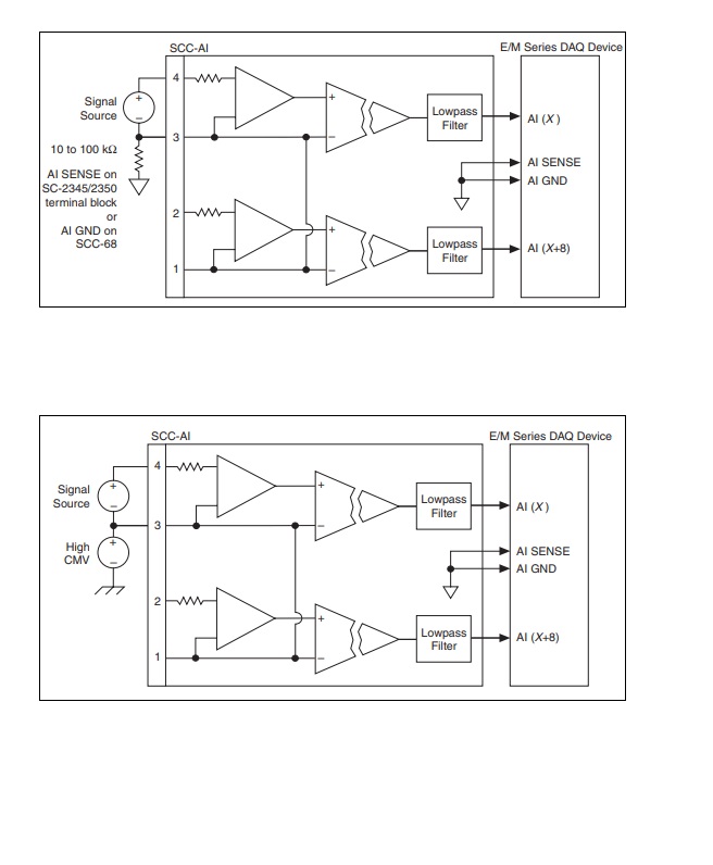 National Instruments SCC-AI13 modules are double channel bank-isolated analog input modules designed for reading input voltages from ±50 mV to ±42 V. Both channels of a SCC-AI13 module incorporate the following: an instrumentation speaker, a low-pass filter, and a potentiometer for calibration. These modules are rated for Category I and offer a safety working isolation of 300 V for each module.