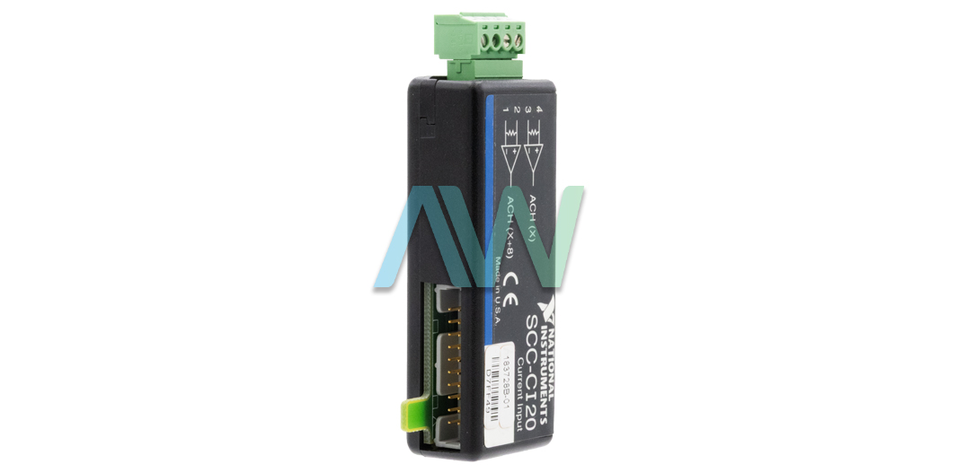 The SCC-CI20 (Part Number: 777459-05) is a Current Input Module from National Instruments. This model has the capability to convert current into voltage. The NI SCC-CI20 Current Input Module utilizes a resistor and has the resistance value of 249 Ohms. The instrument inputs the output voltage to a DAQ as the voltage signal. The value for the signal voltage ranges from 0 to 5 volts. The DAQ device used is from the E series.
