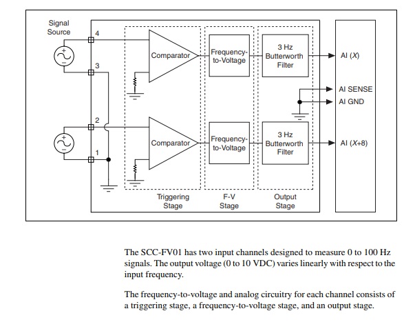 This National Instruments SCC-FV01 Frequency-to-Voltage Module offers 2 RSE input channels, +/-200 mV of input signal amplitude, a minimum input frequency of 0 Hz, a maximum input frequency of 100 Hz, a threshold of 0 V, a hysteresis of 200 mV, an output offset of 5 mV maximum, and an analog power of 100 mW.