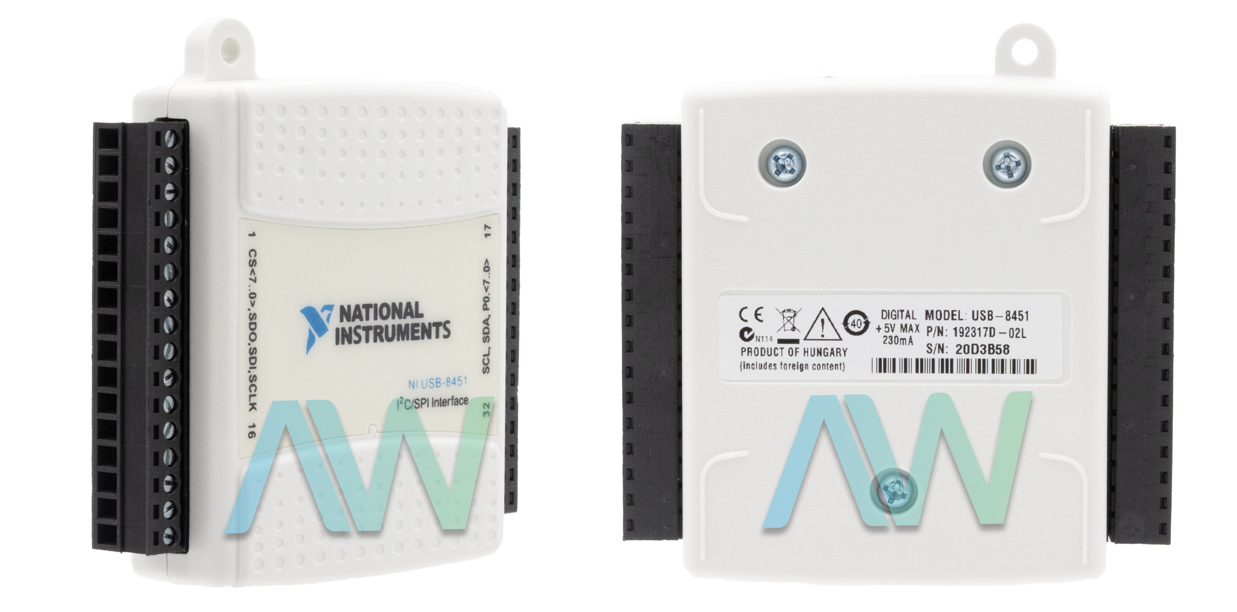 The USB-8451 (Part Numbers: 779553-50, 779553-01, 192317D-02, and 192317D-02L) is a bus-powered, full-speed I²C/SPI Interface Device from National Instruments. This device is made to connect to and communicate with integrated circuits (I2C), peripheral interface devices, and System Management Busses. With its eight digital I/O lines, the NI USB-8451 Interface Device is a portable communication solution intended for use with consumer electronics and integrated circuits. Each of these lines may be configured independently to function as a static digital input or output line. In addition, they can be utilized in a variety of applications such as I2C device configuration or toggling LEDs. The I/O connectors of this Interface Device include a USB series B receptacle and two 16-position screw terminal plug headers.