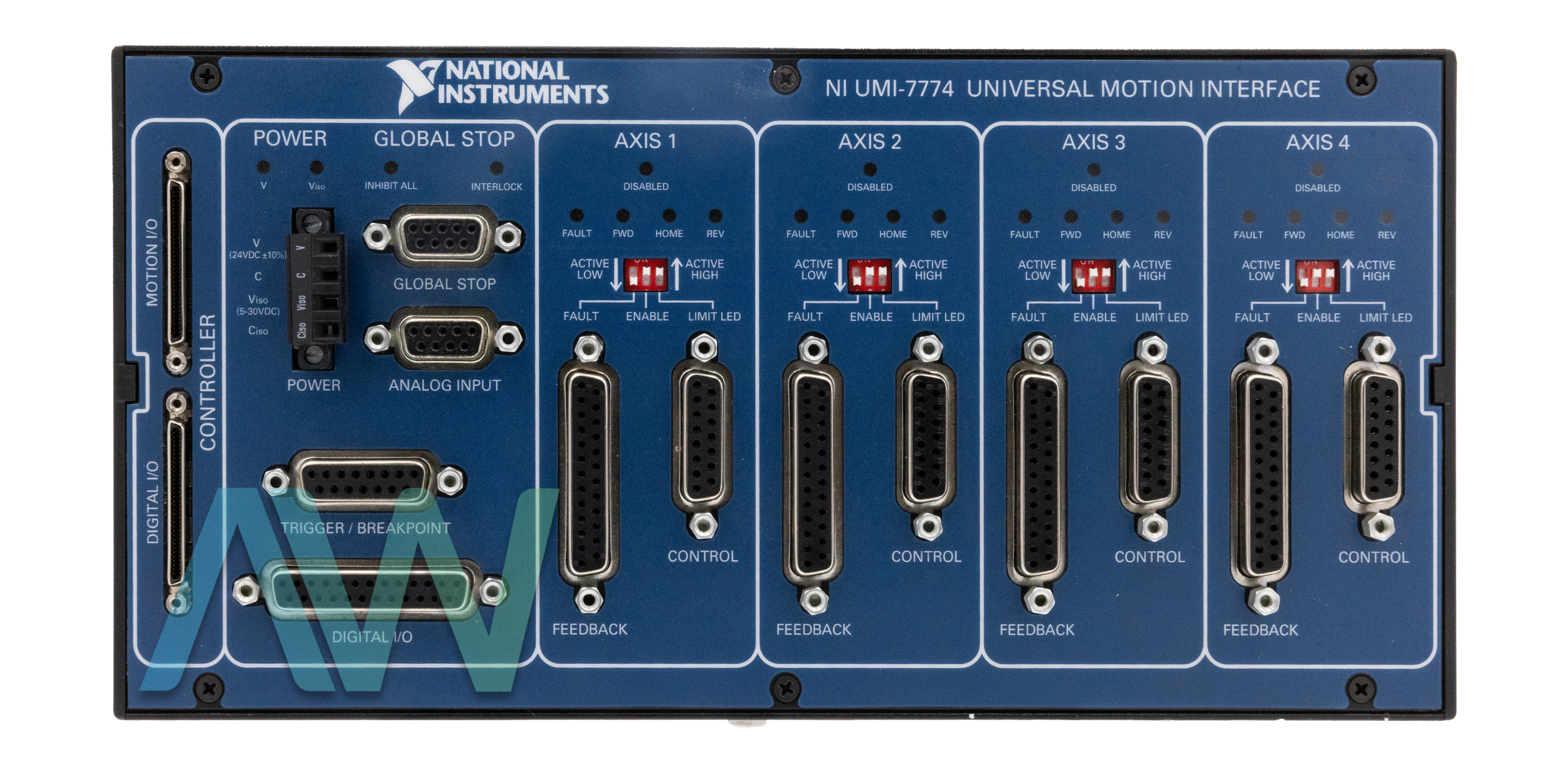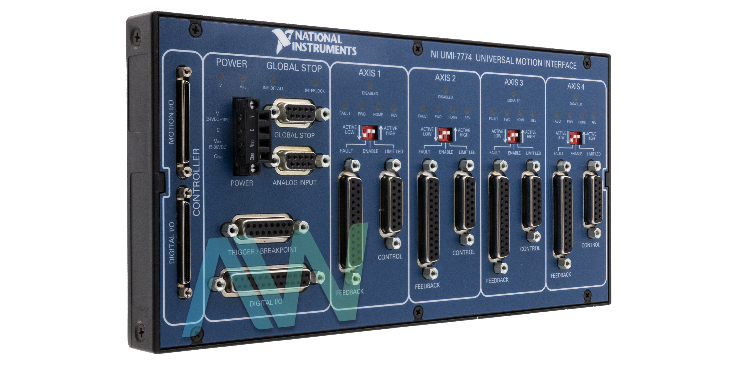 The motion input and output are connected to the motion controller via a single interface connection, which makes field wiring simpler. Each axis has its own individual feedback and control D-SUB connectors. The 778558-01 also provides access to up to eight digital inputs and eight digital outputs by connecting digital inputs and outputs to the controller via a separate wire. Host bus monitor power interlock is a noteworthy feature that immediately turns off the drive in the event that the host computer goes down or the motion input/output interface cable is removed.
