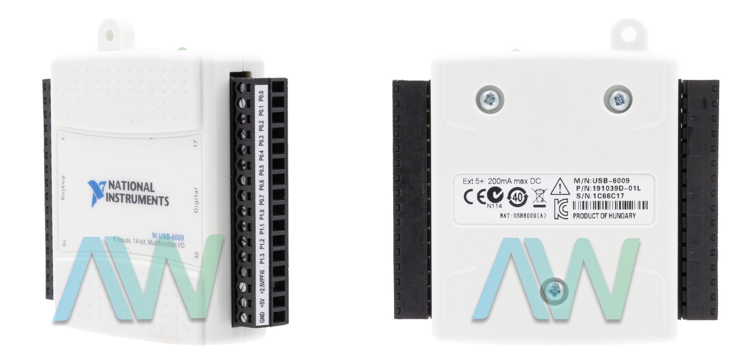 National Instruments part number 779026-01 is an identifying part number for the USB-6009, a USB Multifunction I/O Device. This device offers analog I/O, digital I/O, and a 32‑bit counter. It has 8 Analog Inputs (14-bit, 48 kS/s), 2 Analog Outputs (150 Hz), and 12 Digital Inputs/Outputs. It provides essential functionality for applications like simple data logging, portable measurements, and academic lab experiments. The device features a lightweight enclosure and is bus-powered for easy portability. Connecting sensors and signals to the USB‑6009 is straightforward with its screw-terminal connectivity.
